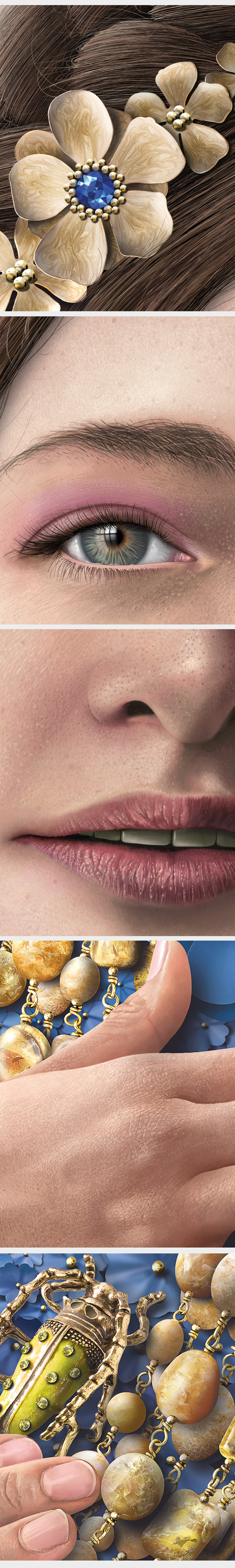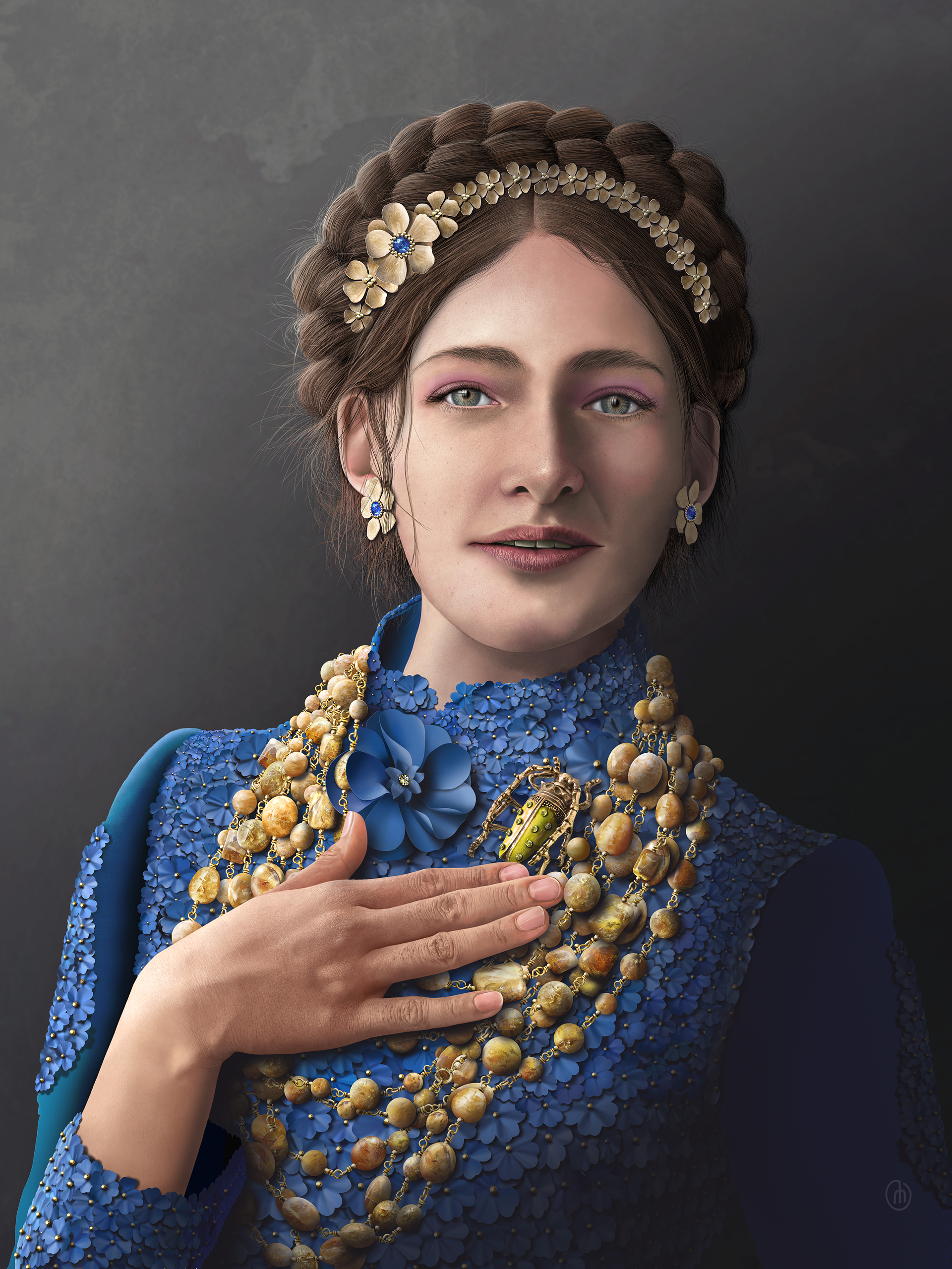 Met fantasie creëerde ik er een portret van in een huidig tijdperk. Ook de sierraden en kleding zijn pure fantasie.