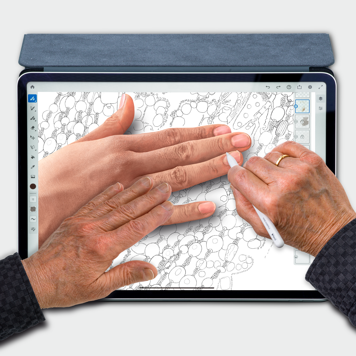 Op de iPad in verschillende delen getekend in Adobe Fresco om daarmee op hogere resoluties een betere kwaliteit te krijgen na montage in het totale eindformaat.