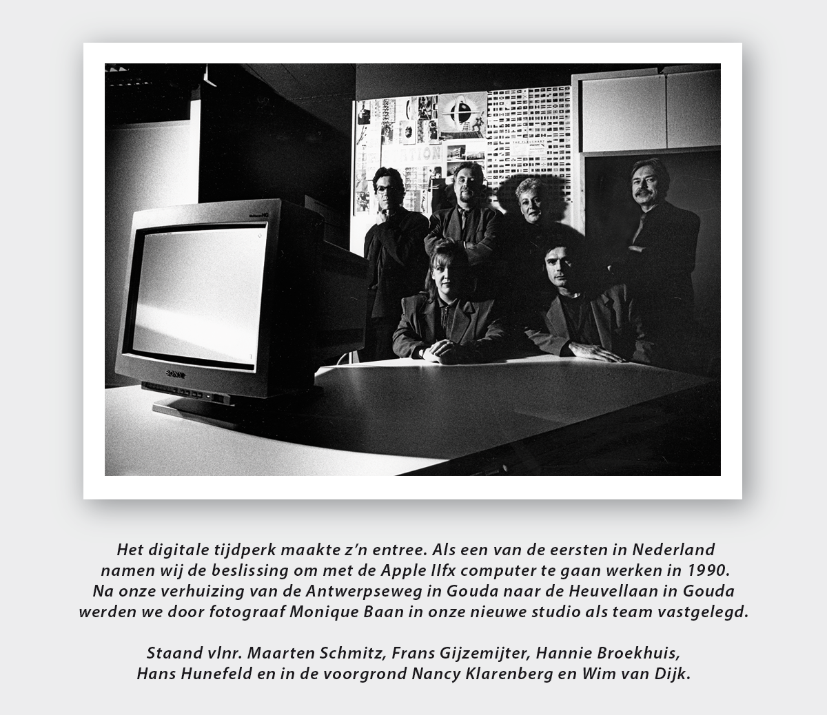 De grootste verandering in het produceren van creatief werk was de komst van de Apple IIfx computer in 1990. Als een van de eersten in Nederland werd besloten hiermee te gaan werken. Eigenlijk een historisch feit, want het gebruik van een computer in grafische toepassingen werd voor het eerst mogelijk gemaakt door dit ontwerp van Steve Jobs. In dat zelfde jaar kwam ook de allereerste Photoshop versie 1.0 uit voor de Apple. Ook deze ontwikkeling moest je zelf ontdekken. Een totaal onbekende factor, waarmee we echte pioniers werden. Cursussen waren er nog niet, je moest het dus zelf ontdekken. Het digitale tijdperk was hiermee begonnen. We behoorden tot de eersten die een domeinnaam lieten registreren. Nu we ruim 35 jaar verder zijn, is het zo vanzelfsprekend dat beeldcreaties voornamelijk uit de computer rollen en dat onze communicatie volledig via Internet loopt.