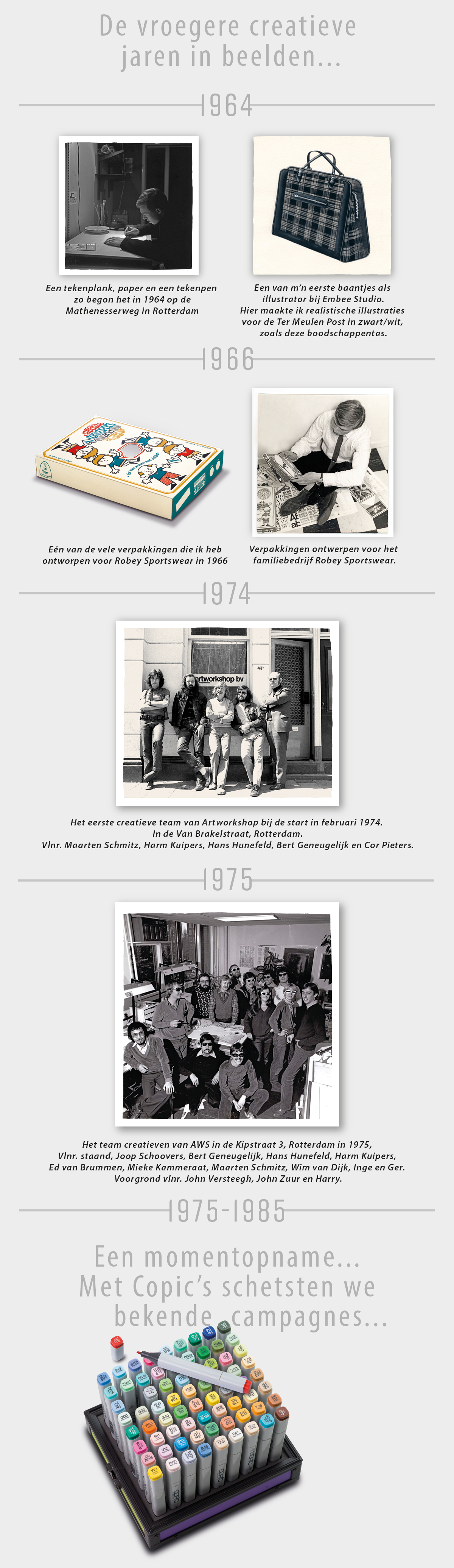 De economie was groeiend, de vraag naar creatieve mensen in de reclamewereld was groot en in februari 1974 starte ik als Art-director samen met een aantal collega’s het creatieve team ‘Artworkshop’ in Rotterdam, later werd deze naam afgekort naar AWS. Een reclamestudio voor concepten en uitvoering in reclame-campagnes. Ons eerste adres werd al snel te klein, we verhuisden naar een groot pand ik de Kipstraat zo groeiden we in de jaren ’70 - ’80 naar een van de grootste reclamestudio’s van Rotterdam. We maakten in samenwerking met vele andere bureau’s campagnes voor grote merken, zoals o.a. Zeeuws Meisje, Blue Band, de Betuwe, Atlas Copco en Jamin. Een hectische tijd waarmee we met een groot team dagelijks veel energie moesten stoppen om aan de vraag te kunnen voldoen.